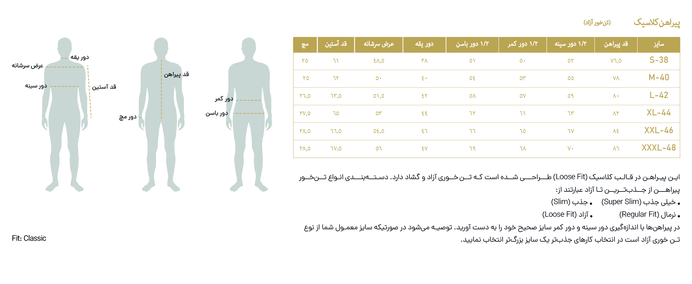 Classic / Loose Fit – آزاد: دارای فضای بیشتر در ناحیه سینه، کمر و شکم؛ مناسب افرادی که آزادی حرکت و راحتی بیشتر را ترجیح میدهند.