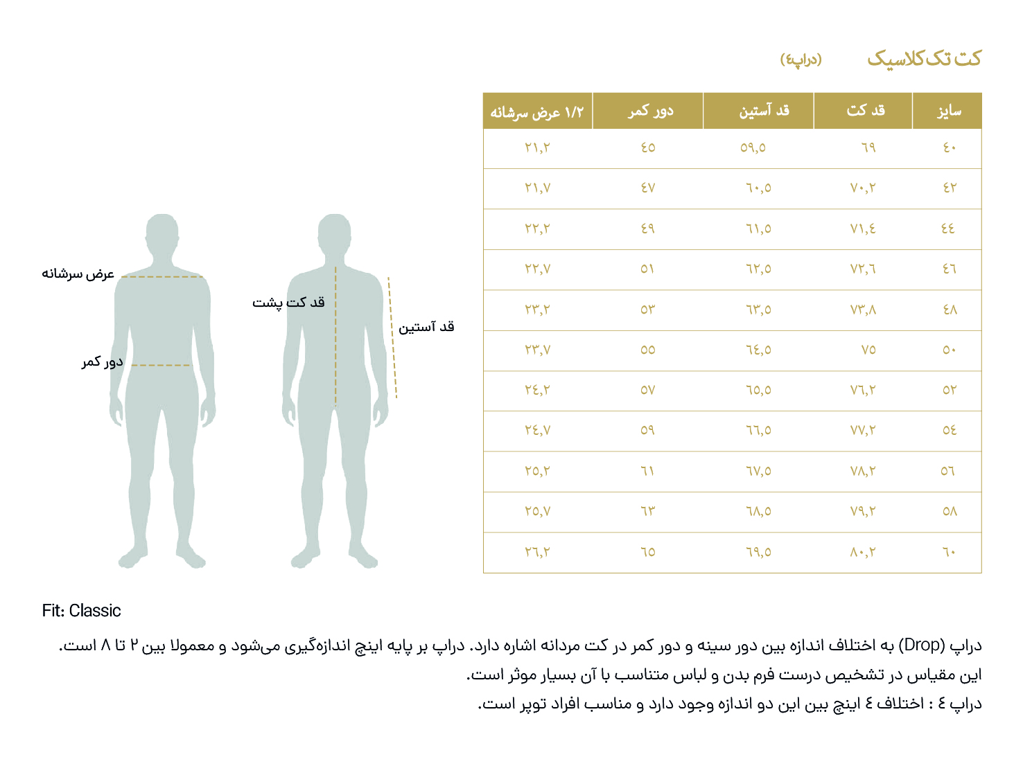دراپ ۴: اختلاف ۴ اینچ بین دور سینه و دور کمر؛ مناسب افراد توپر و دارای دور کمر بزرگتر.