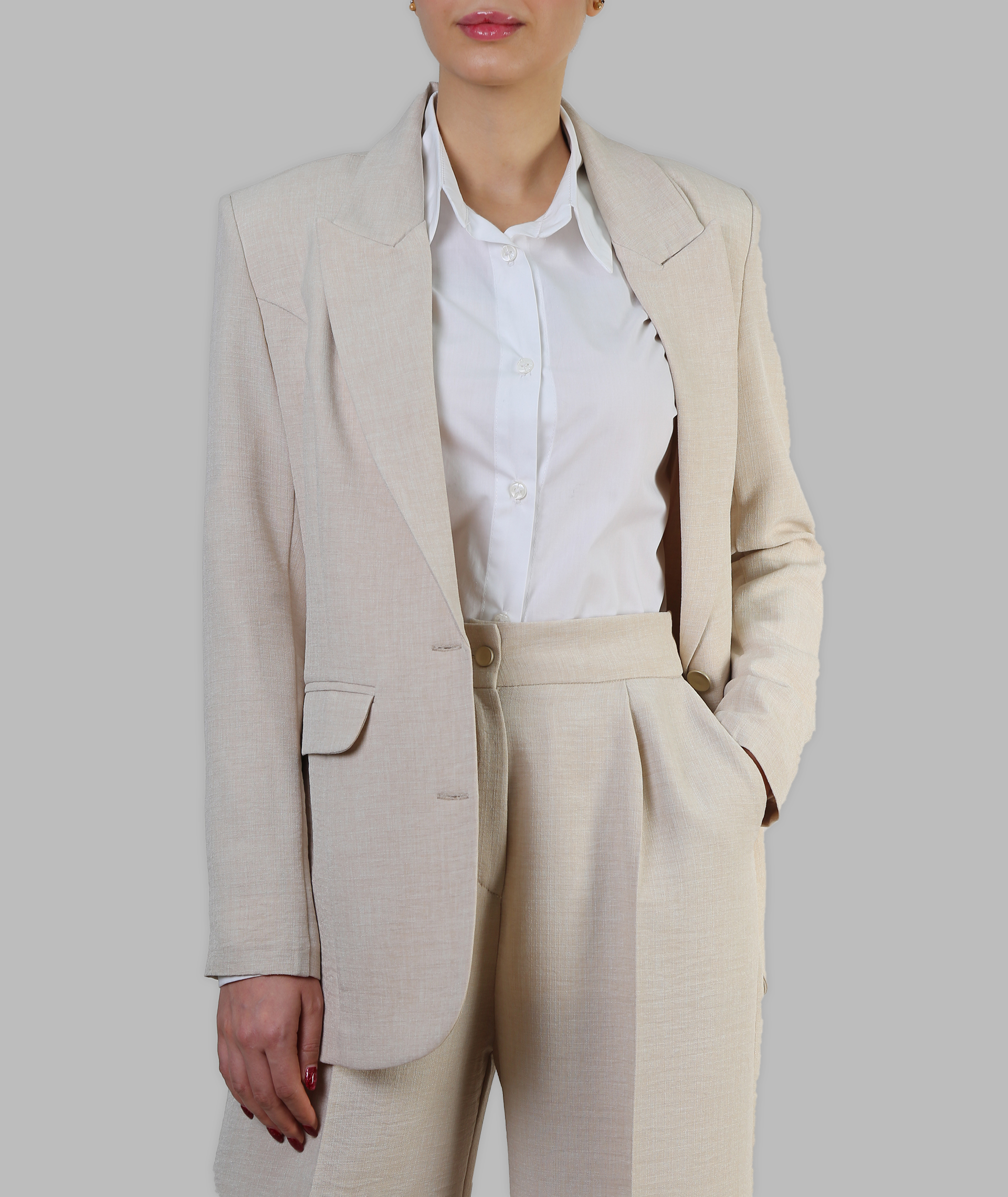کت و شلوار زنانه مدل فامو، تلفیقی از ظرافت و قدرت است. این محصول با طراحی خاص و استفاده از پارچه کتان کجراه با کیفیت، انتخابی ایدهآل برای خانمهایی است که به دنبال استایلی متفاوت و جذاب هستند. یقه انگلیسی پهن، کمربند سگکدار و جزئیات دقیق به همراه شلوار دمپا با طراحی مرتب و چاک پشت کت، این کت و شلوار را به یک محصول مدرن و پر طرفدار تبدیل کرده است. طراحی چاک ظریف در پشت کت علاوه بر ظاهر مناسب باعث آزادی بیشتر در حرکت شده است.